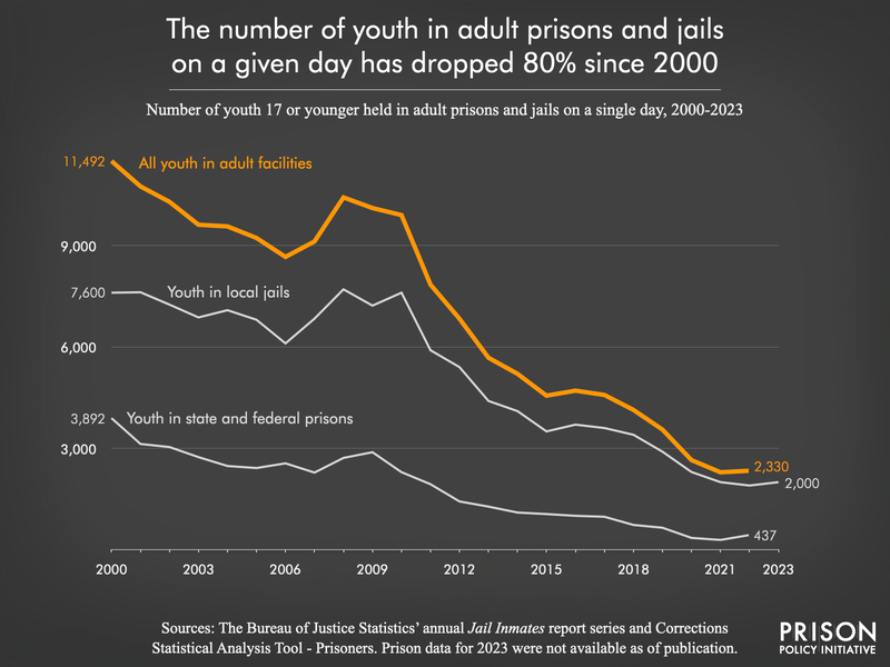The number of youth in adult jails and prisons fell from 4,577 in 2017 to 2,437 in 2023. (Our previous report showed 4,535 youth in adult prisons and jails in 2017, but the number of youth in prisons in 2017 has since been updated by the Bureau of Justice Statistics from 935 to 977.) ↩